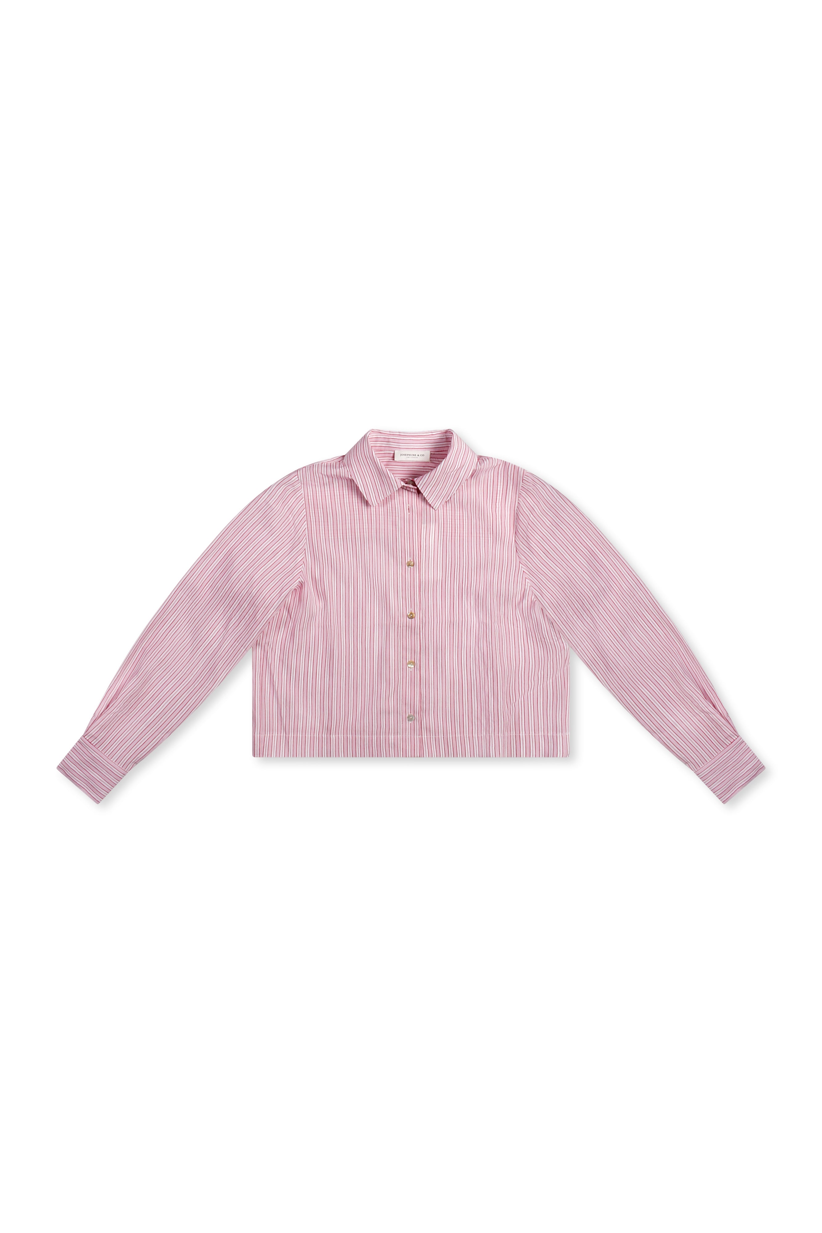 Zart rosa-weiß gestreifte Crop-Bluse mit klassischem Hemdkragen in einem trendigen Design. Durchgehende Knopfleiste vorne und lange Ärmel mit Manschetten. Moderne verkürzte Länge perfekt für lässige Outfits oder zum Kombinieren mit High-Waist Hosen und Röcken. Der Stoff fühlt sich total angenehm fließend an und die Bluse sitzt schön locker.