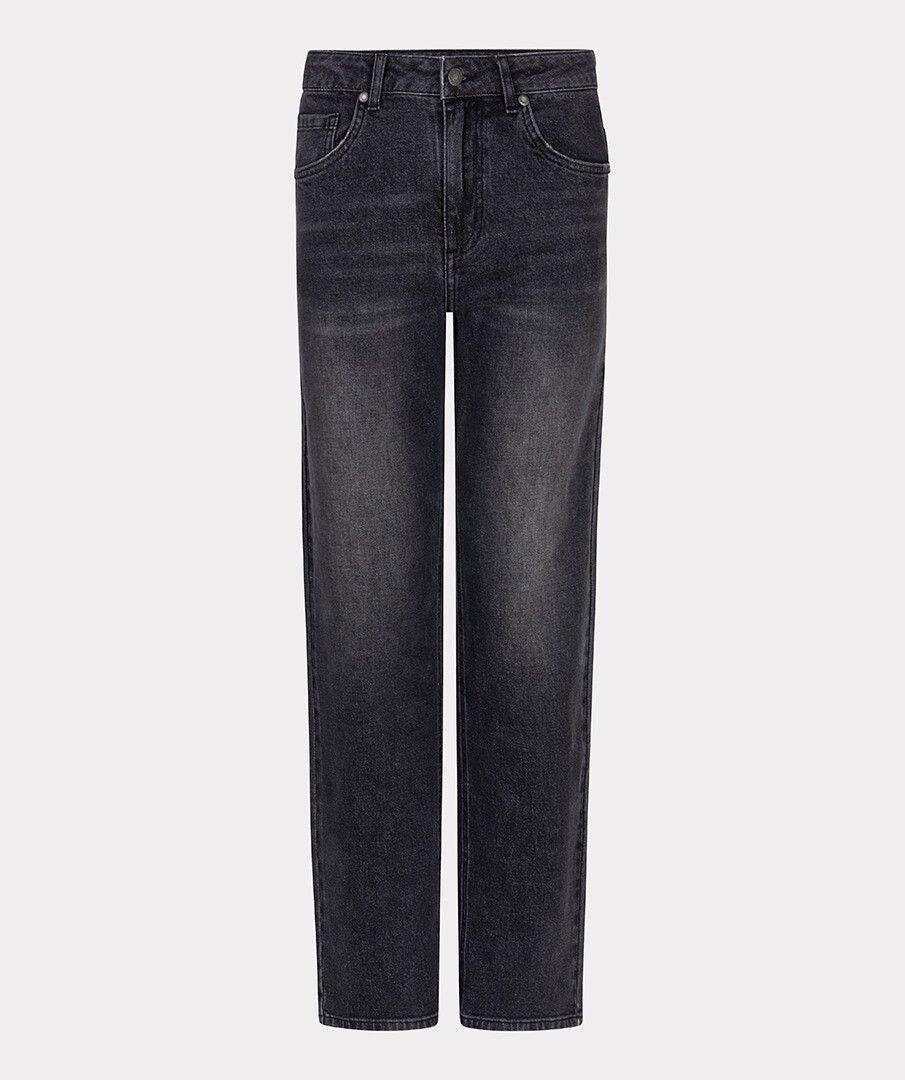 Gerade Highwaist-Jeans in Schwarz mit Seitentaschen vorne und hinten. Die Jeans ist angenehm bequem.