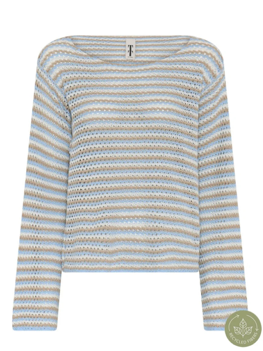 Leger geschnittener Pullover in Lochstrick mit weitem Rundhalsausschnitt. Dezente Streifen in weiß, taupe und hellblau. Gerade Form mit langen Trompetenärmeln und gerader Saum ohne Rippenbund.
