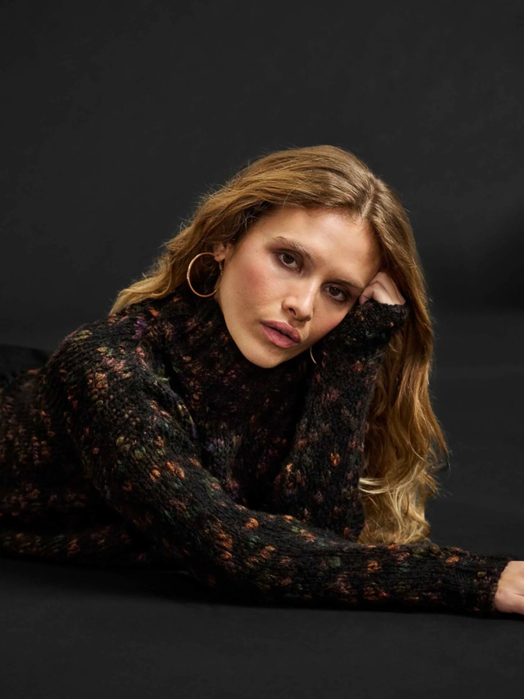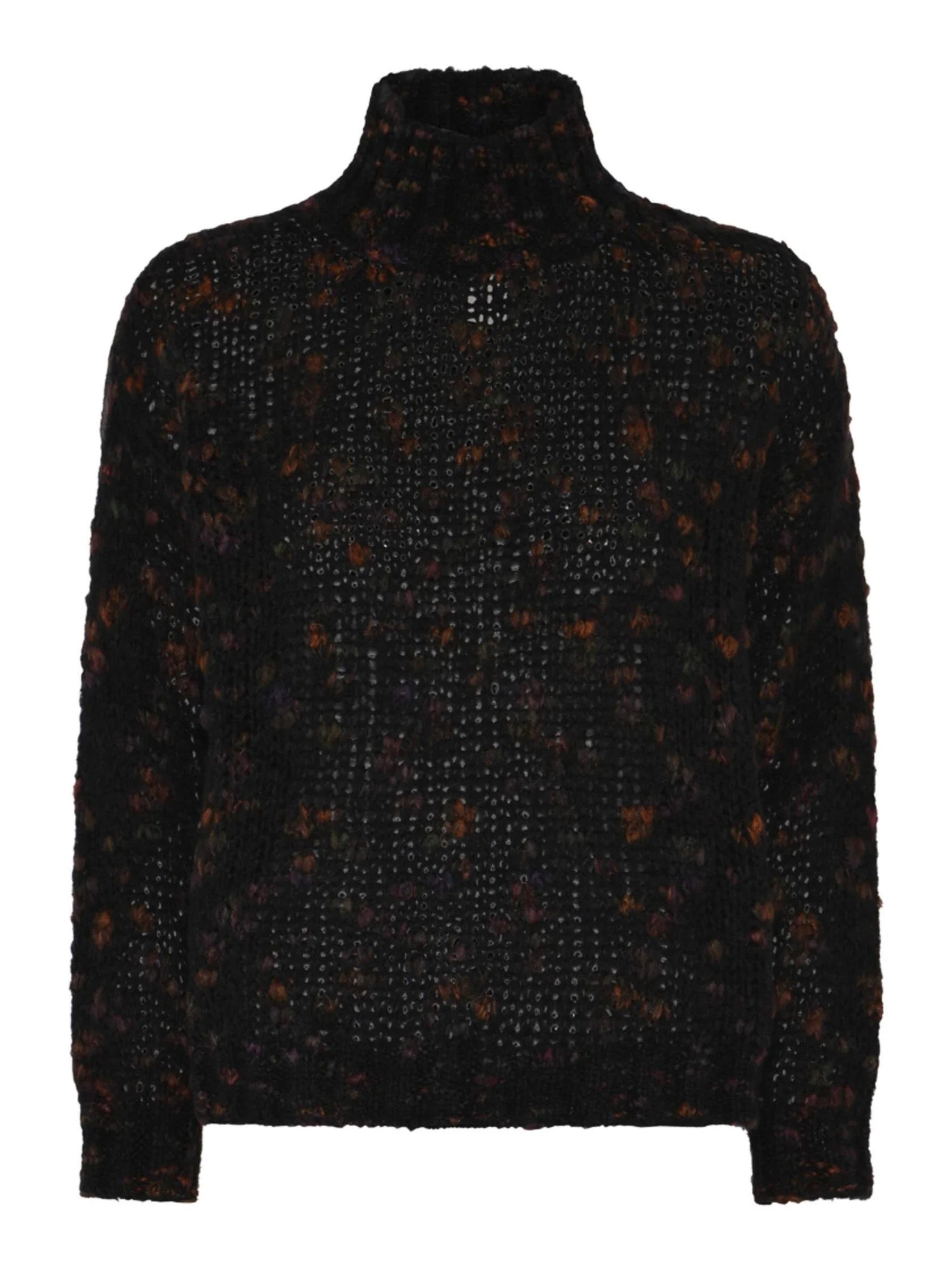 Bequem geschnittener leichter Pulli im mehrfarbigen Bouclé Garn mit Stehkragen. Das Bündchen an Ärmeln und Saum ist locker.