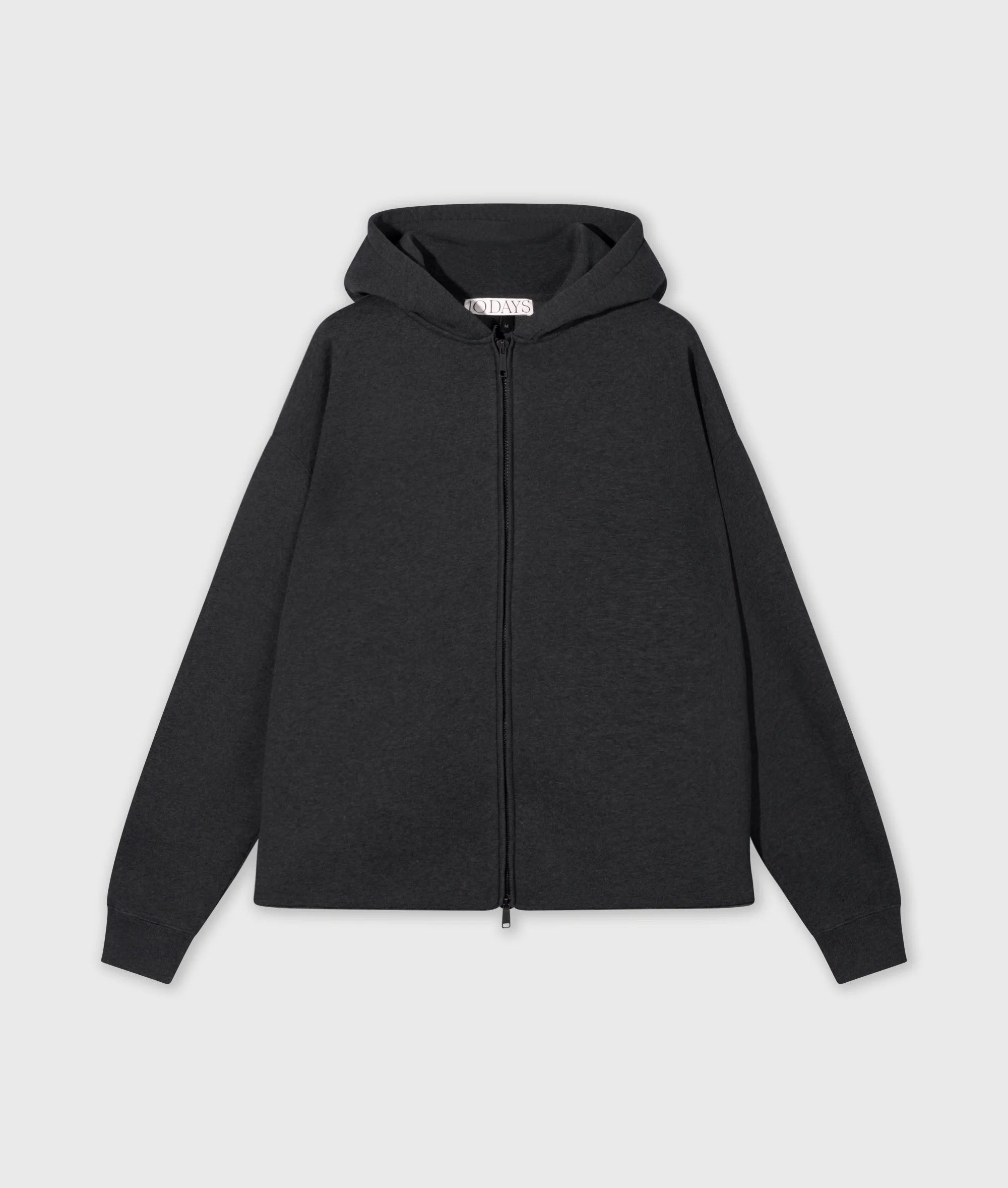 Oversized Fit Statement Hoodie mit Reißverschluss aus angerautem Baumwollfleece. Kapuze mit „10“-Aufnäher, Rippenstrickbündchen, einem tiefen Schulteransatz und einem Reißverschluss.