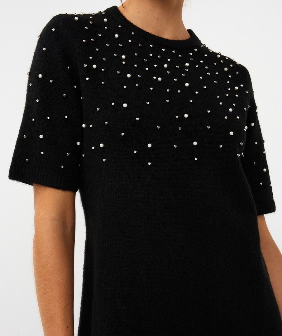 Feinstrickkleid mit wunderschönen Perlenverzierungen am Ausschnitt.