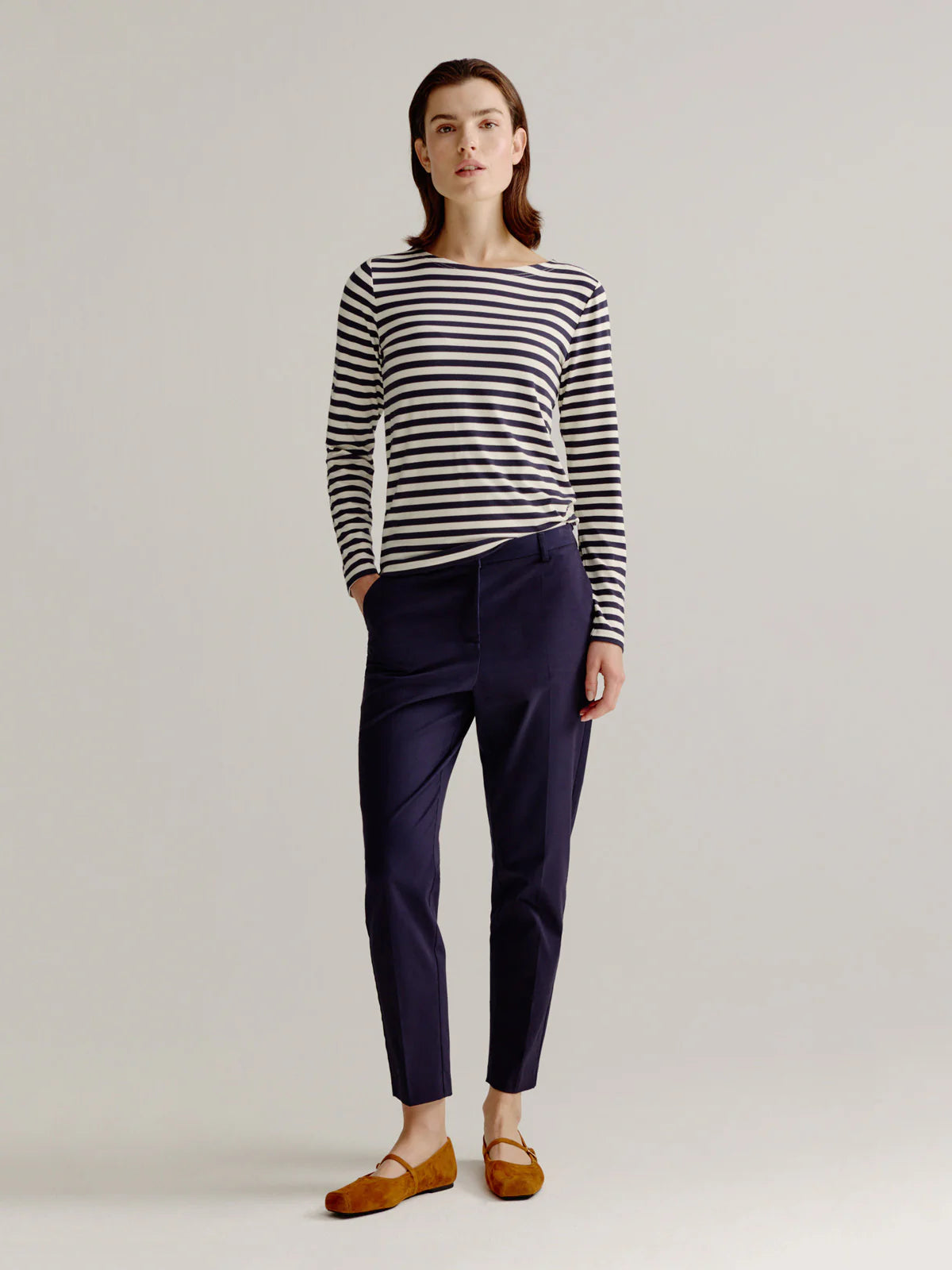 Natürlich raffiniert. Luisa ist die Art von Hose, die Schlichtheit in sanftem Luxus zum Ausdruck bringt. Sie besteht aus dem gleichen leicht gebürsteten Baumwoll-Modal-Mix – mit Leinwandbindung und dezenter Papieroberfläche, die dem Stoff natürlichen Glanz und ein geschmeidiges Tragegefühl verleiht. Das gerade Bein sorgt für eine luftige, zeitlose Silhouette, während der elastische Bund hinten dezenten Komfort ohne Stileinbußen bietet. Vorne befinden sich gerade Seitentaschen, hinten eine Leistentasche, die an klassische Schneiderkunst erinnert.