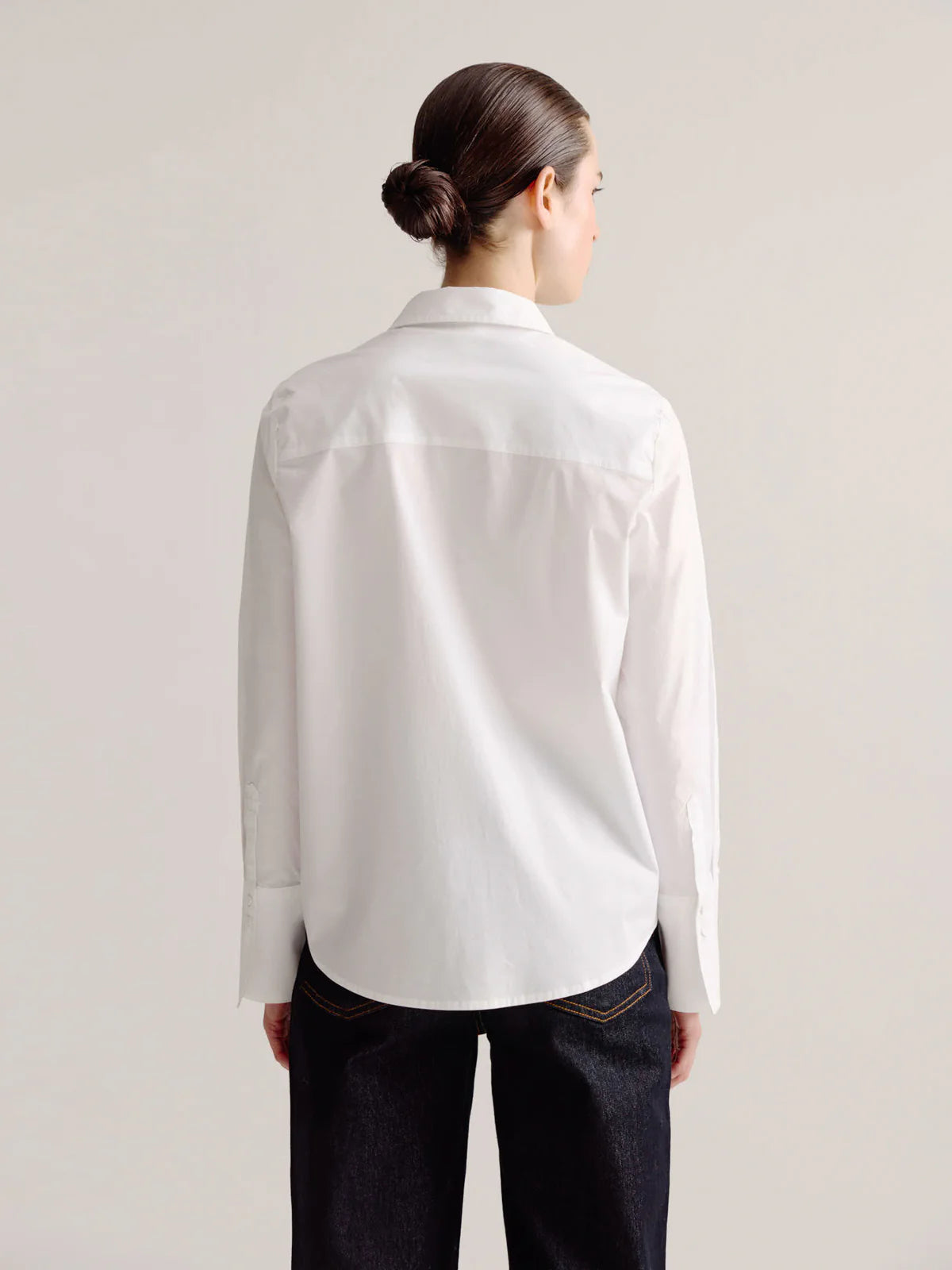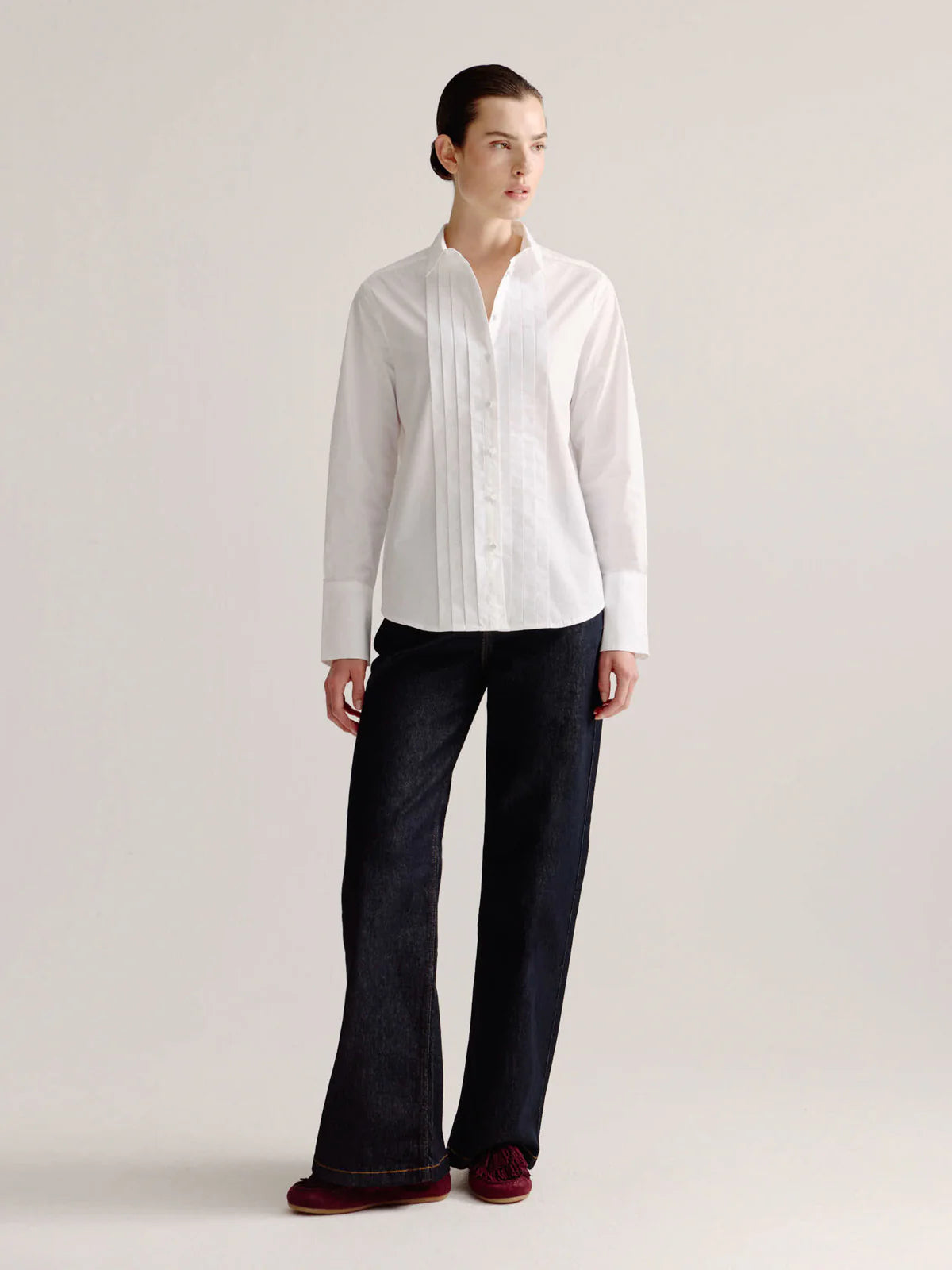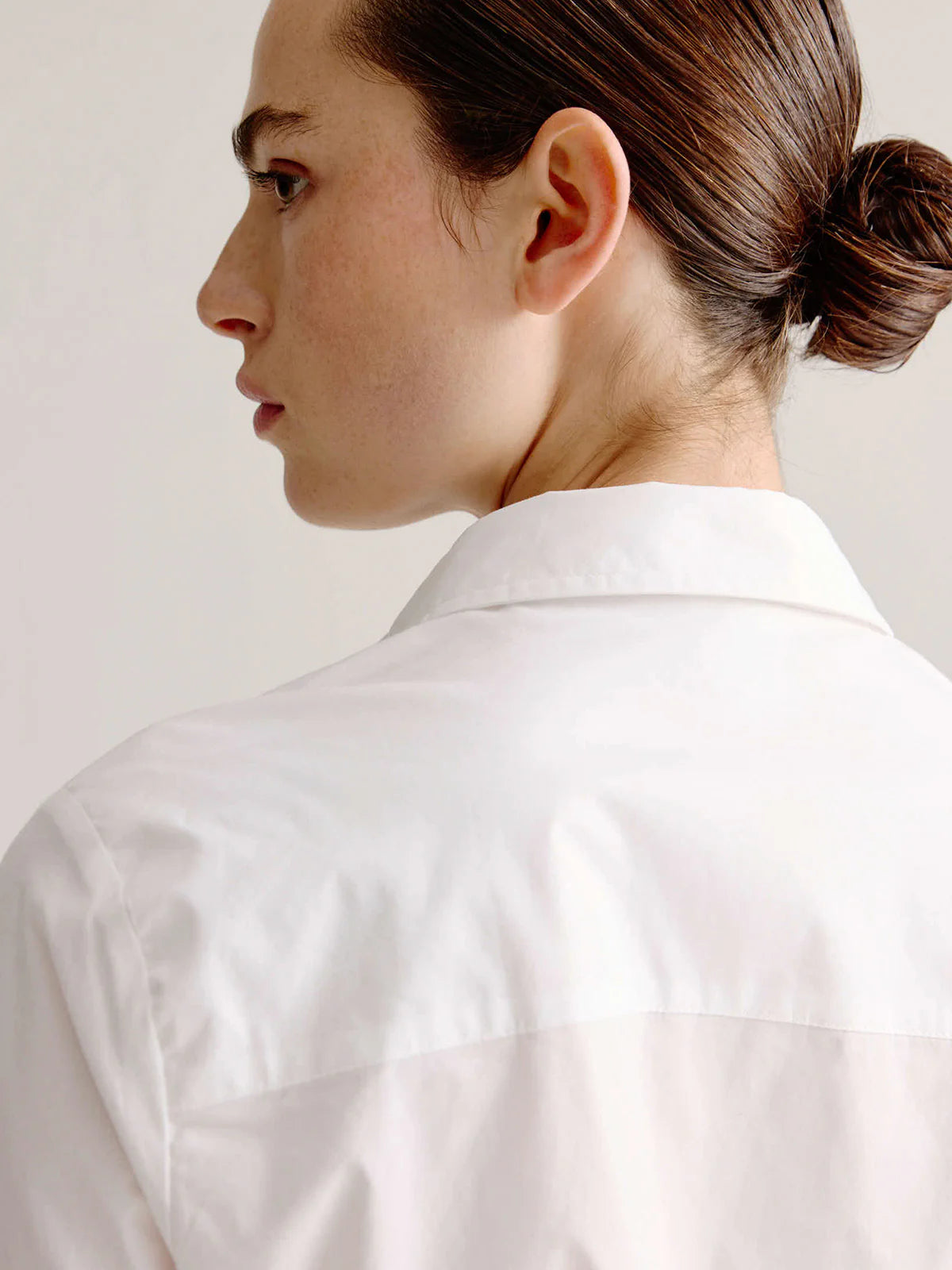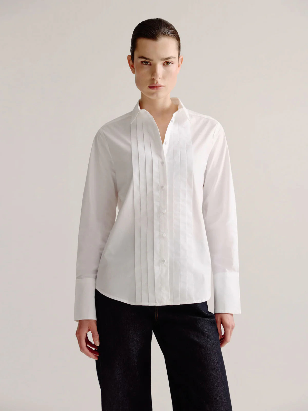 Raffinierte Frische. Lynn ist eine weiße Popeline-Bluse mit Charakter. Die frische Baumwollmischung mit leichtem Stretchanteil sorgt für Tragekomfort, während die feinen Plissee-Falten auf der Vorderseite für einen dezenten Twist sorgen. Pur, feminin und perfekt für den Alltag.