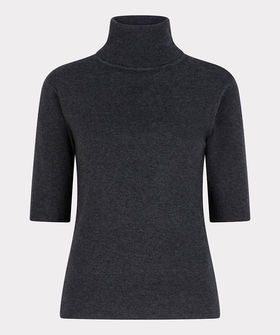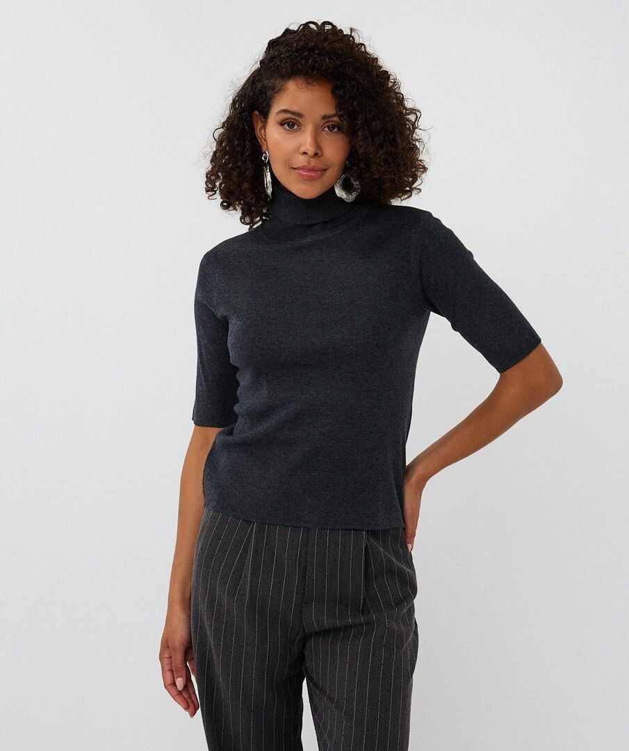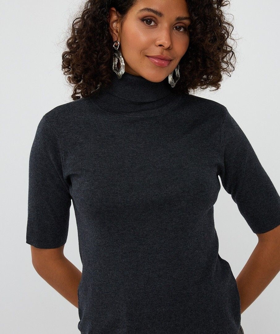 Schöner, weicher und figurbetonter Rippen-Rollkragenpullover mit 3/4-Ärmeln. Ein optimales Oberteil unter einem Blazer, wenn Business angesagt ist.